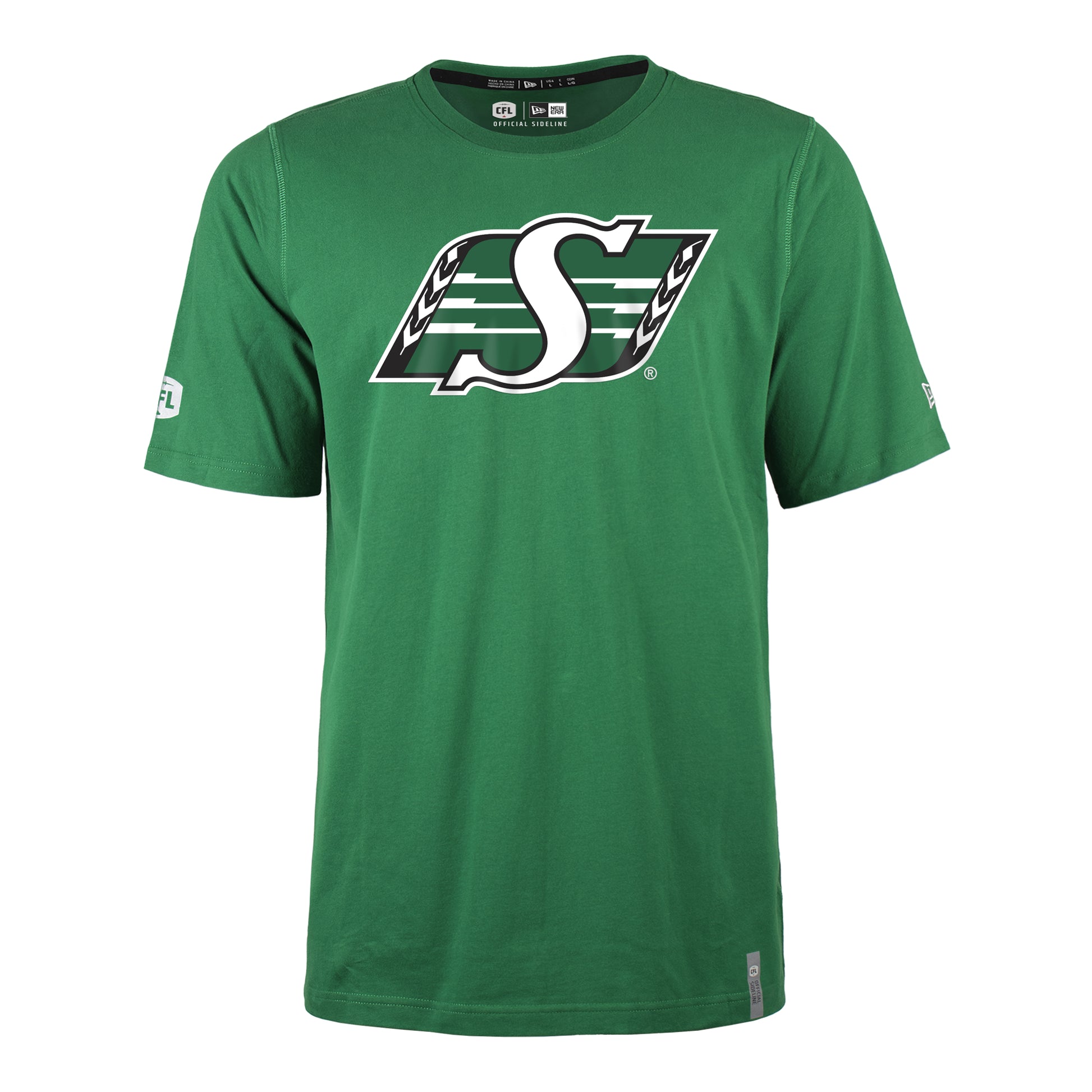 Team color short sleeve cotton tee with large primary logo on front chest. CFL badge on right sleeve, and reflective Official Sideline on bottom front hem.