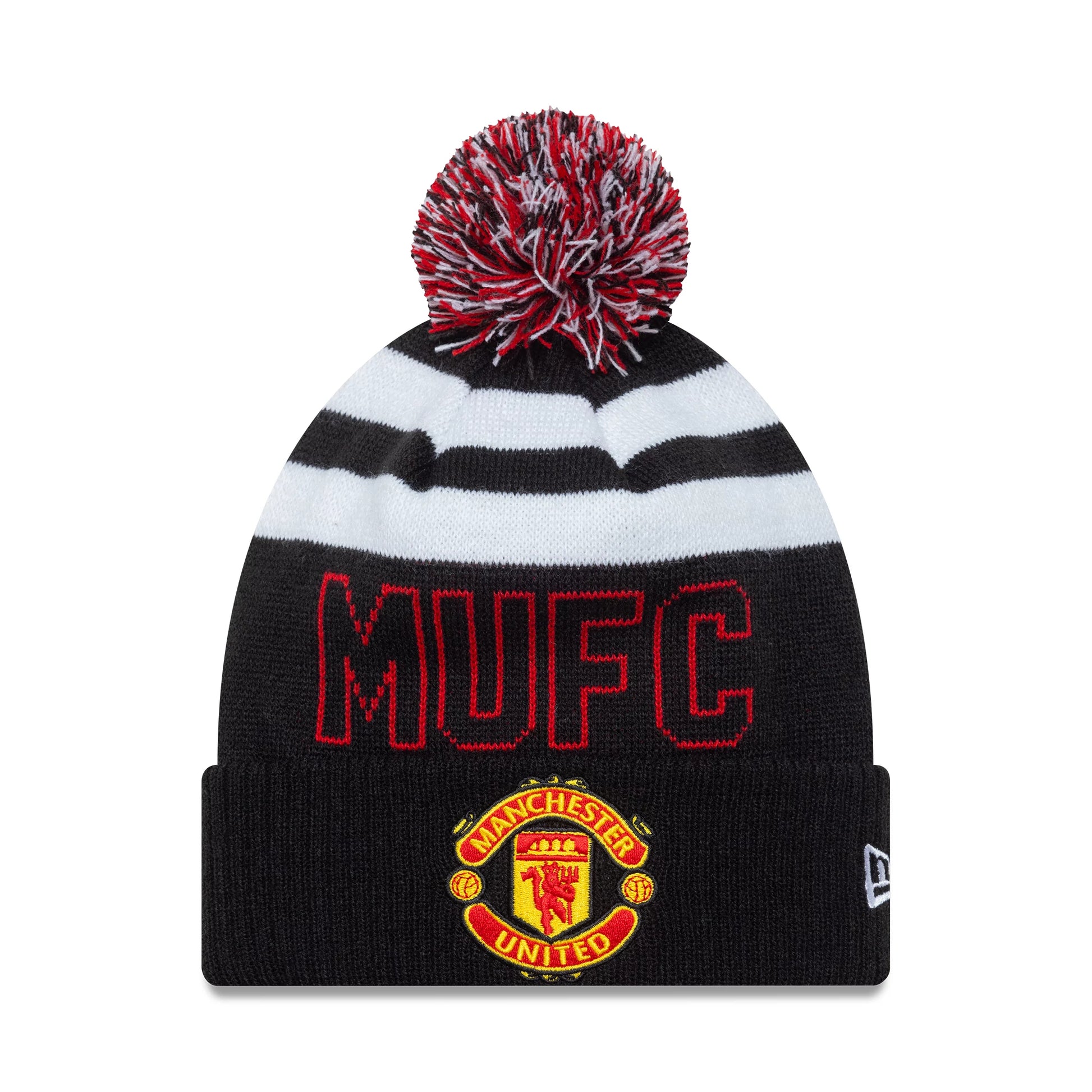 This Manchester United New Era Black & Red Pom Beanie is made from 100% acrylic. It features an embroidered crest on the front.